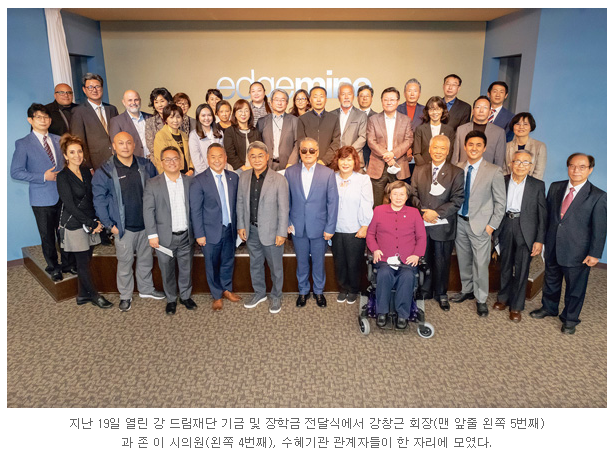 한인 대형 여성의류업체 ‘에지마인’의 강창근 회장이 설립한 비영리 자선재단 ‘강 드림재단’(Kang Dream Foundation)이 LA 한인회를 비롯해 한인 커뮤니티 봉사에 앞장사고 있는 한인 및 주류 기관들에 20만 달러의 지원금을 전달하고 학생들에게도 장학금 12만 달러를 전달하는 등 올해도 총 32만 달러 규모의 장학사업을 펼쳐 한인사회의 귀감이 되고 있다.