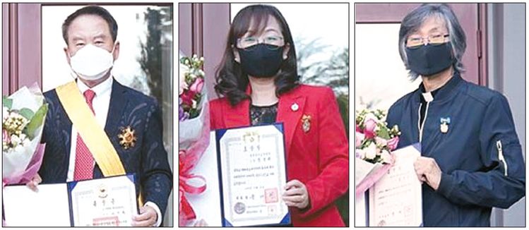 제14회 세계한인의 날 기념 유공자로 선정된 한인 4명이 정부 포상을 받았다. 9일 LA총영사(총영사 박경재)관은 총영사 관저에 하기환 LA한인상공회의소 전 회장(국민훈장 무궁화장)·최석호 가주 하원의원(국민훈장 동백장)·장경혜(로사장) 한미특수교육센터 소장(대통령 표창)·김동진 미국성공회 성제임스교회 신부(국무총리 표창)를 초청해 포상 전수식을 열었다. 캘리포니아 한글날(Hangul Day) 지정에 앞장서 온 셰런 쿼크-실바 가주 하원의원(65지구)도 올해 574돌 한글날 기념 대통령 표창을 받았다. 왼쪽부터 하기환 회장, 장경혜 소장, 김동진 신부.