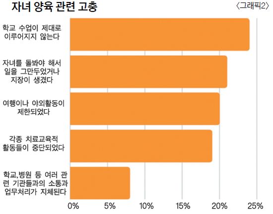 발달장애 자녀 양육 관련 가장 큰 어려움을 묻는 문항에선 학교 수업이 제대로 이루어지지 않는다는 응답이 24%로 가장 많았다. 응답자의 21%는 자녀를 돌보느라 일을 그만두었거나 지장이 생겼다고 답했다.