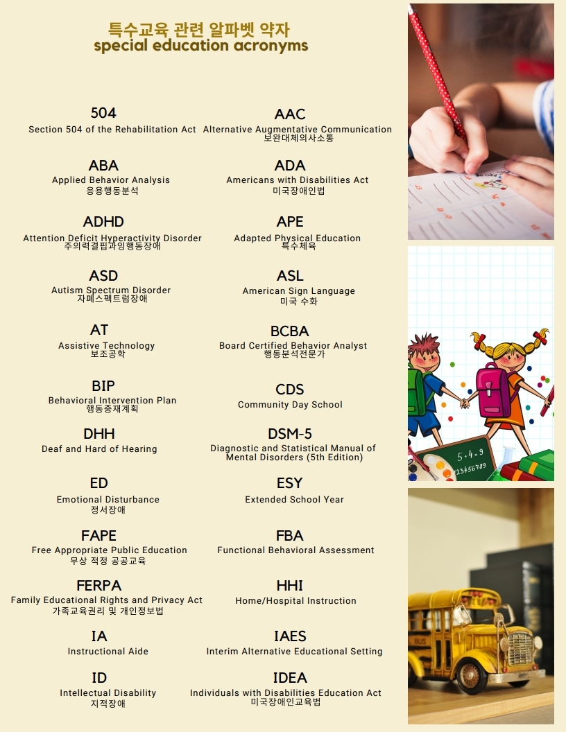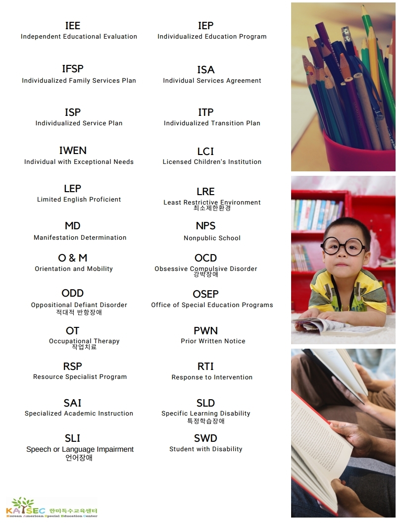 특수교육관련 알파벳 약자들 Developmental Disability 01/15/2020 특수교육 현장에서는 여러가지 문서나 미팅 등에서 많은 용어들이 영문약자로 사용되곤 합니다.교육내용을 잘 이해하고 원활하게 소통하기 위해 알파벳 약자들을 어느 정도 숙지할 필요가 있습니다.자주 쓰이는 특수교육 관련 알파벳 약자들을 정리했습니다. Read more