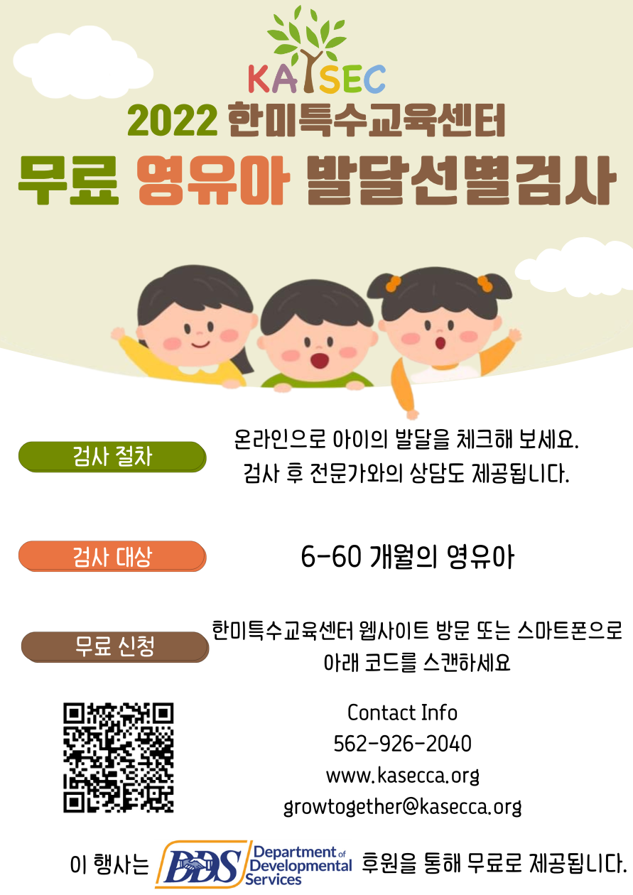 2022 영유아 발달선별검사 Announcement 07/01/2022 위의 QR 코드를 스캔하시거나, 아래 링크를 통해 신청하실 수 있습니다. 발달선별검사 신청하기 https://forms.gle/cErCX4oqMqVPhkxv8 Read more