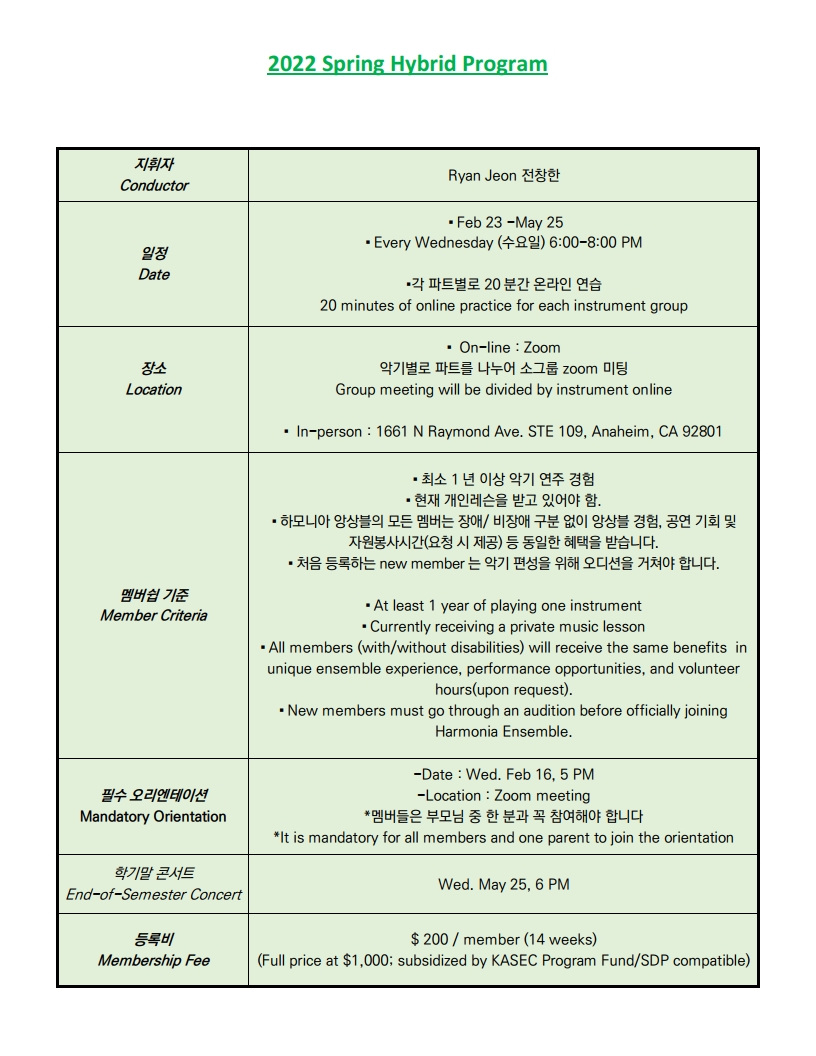 2022 Spring Harmonia Announcement 02/01/2022 등록을 원하시면 클릭하세요! https://old.kasecca.org/student-register/ Read more