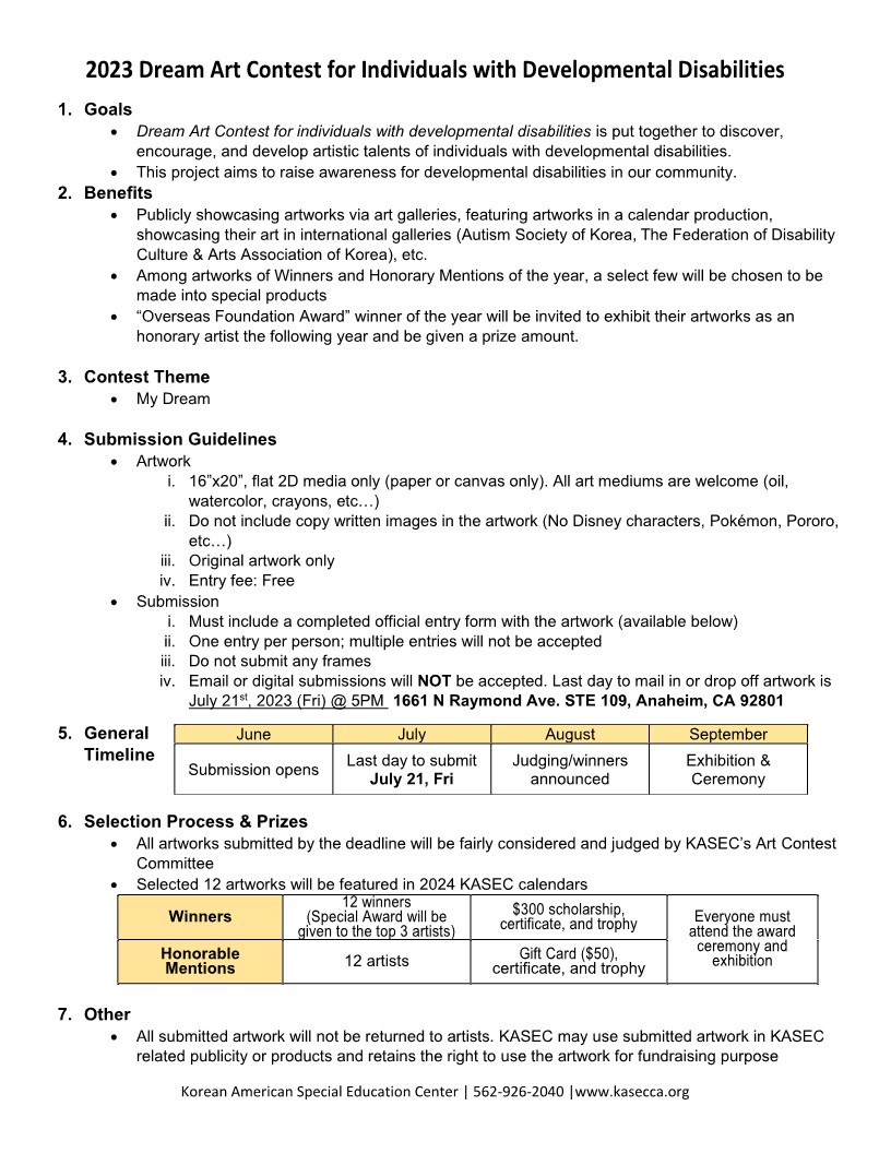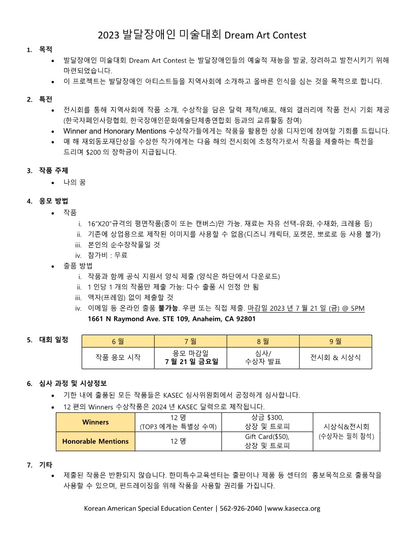 2023년 한미특수교육센터(KASEC)의 발달장애인 미술대회 Dream Art Contest를 아래와 같이 개최합니다.