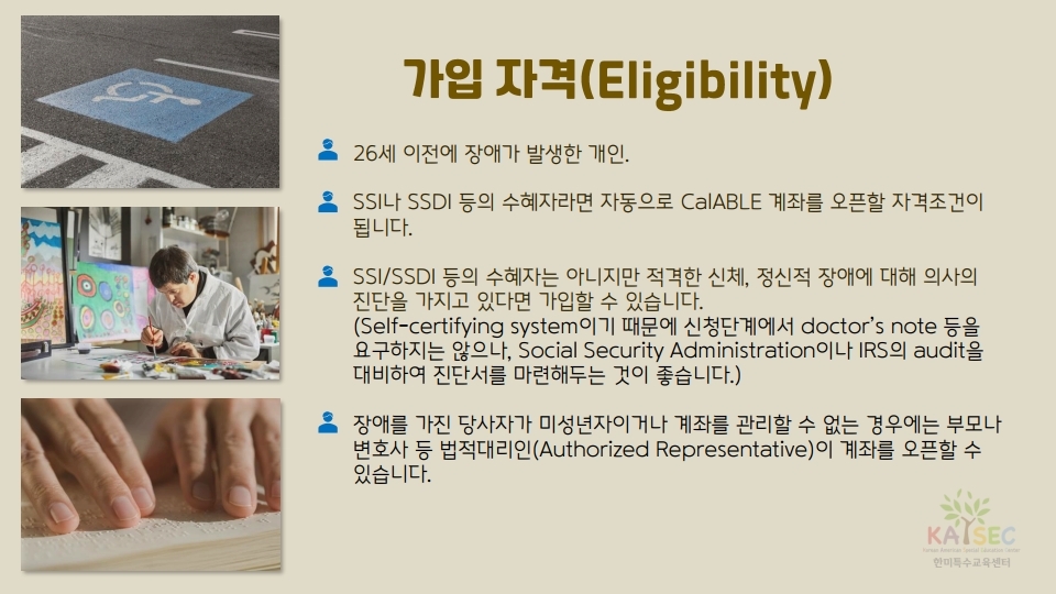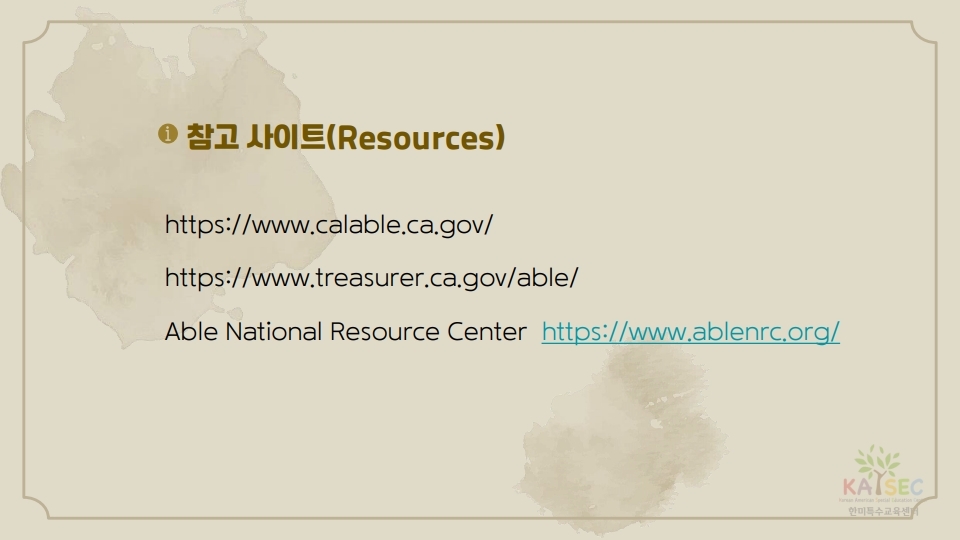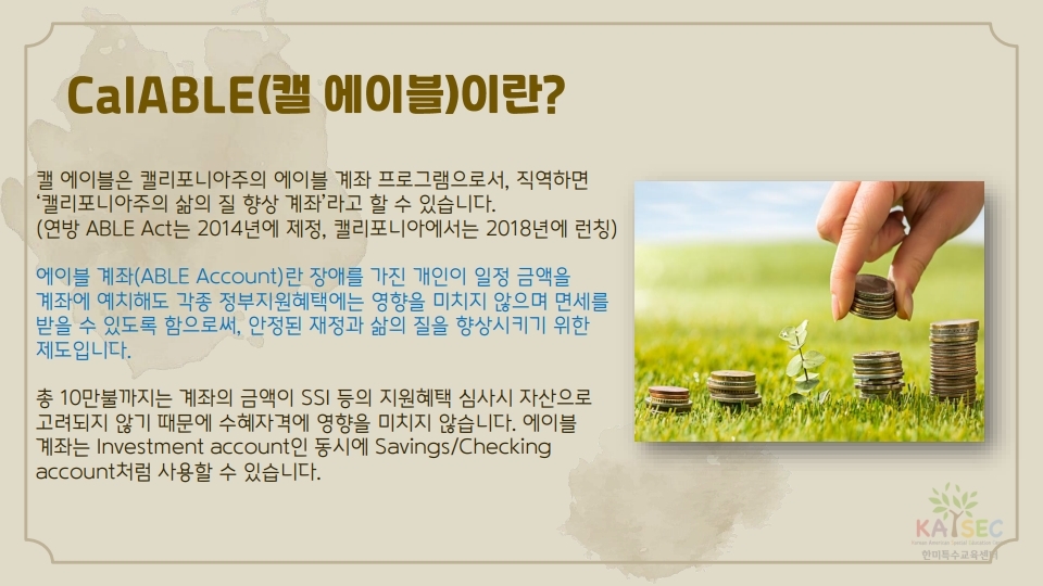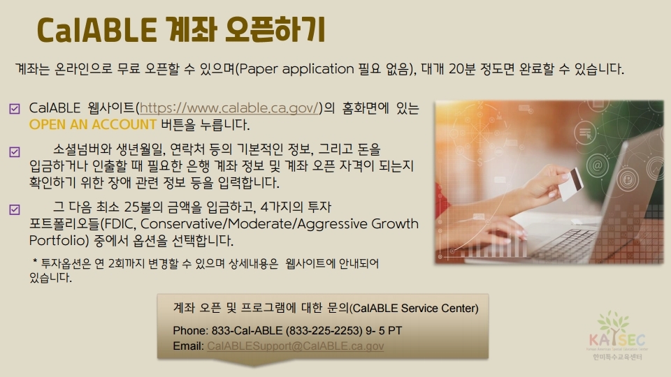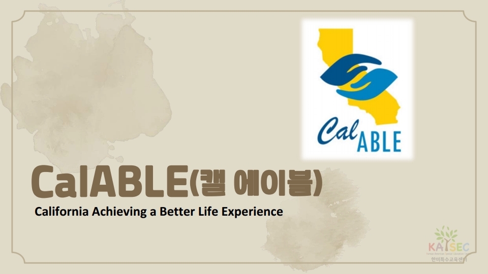 CalABLE_장애인의 재정안정과 삶의 질 향상을 위한 계좌 Developmental Disability 05/21/2021 https://www.calable.ca.gov/ https://www.treasurer.ca.gov/able/ https://www.ablenrc.org/ Read more