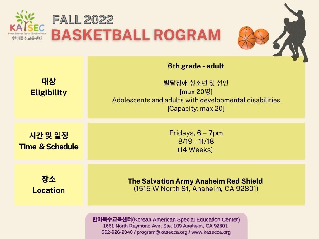 장애/비장애 통합으로 진행되는 KASEC의 프로그램을 후원해 주신 여러 기업과 개인들의 성원에 힘입어, 이번 가을학기에 Orange County 애너하임에서 농구 프로그램을 오픈할 수 있게 되었습니다. 아래 정보를 보시고 시간, 장소, 날짜, 규정 등을 꼭 확인하시기 바랍니다.